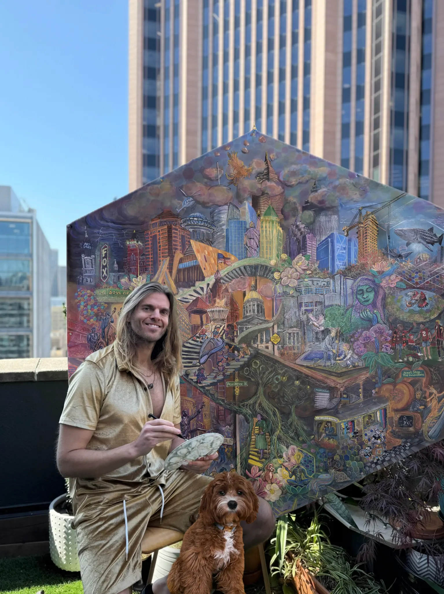 After losing mobility and taking short-term disability in 2023 due to nerve injury and chronic pain, he began painting as a form of rehabilitation and rediscovery — transforming physical limitation into creative liberation.