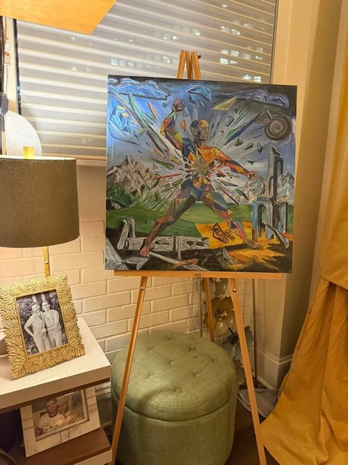 In a world that demands motion, Stillness Held captures the seismic force of a single moment anchored in presence. A fractured figure, half shattering and half forming, stands defiant, centered in luminous energy radiating from the core. It is a response to rupture and rebirth, painted as both a meditation and an uprising.