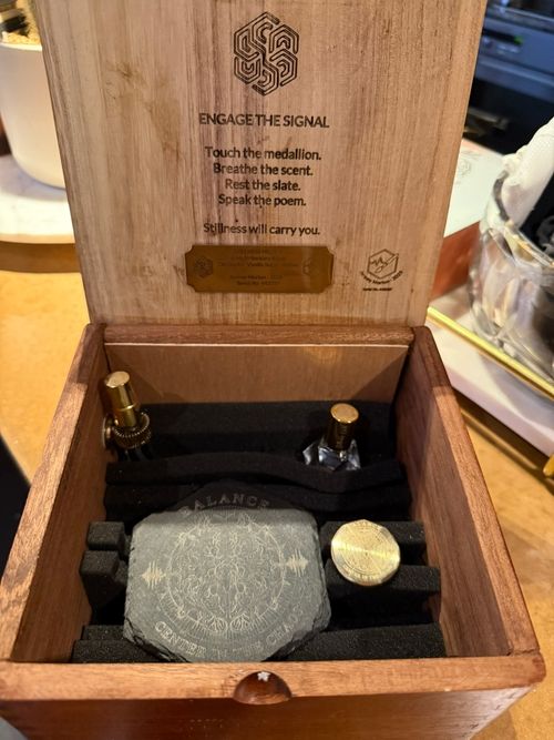 Touch the medallion. Breathe the scent. Rest the slate. Speak the poem. Stillness will carry you.