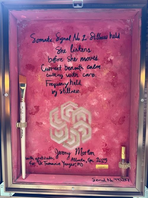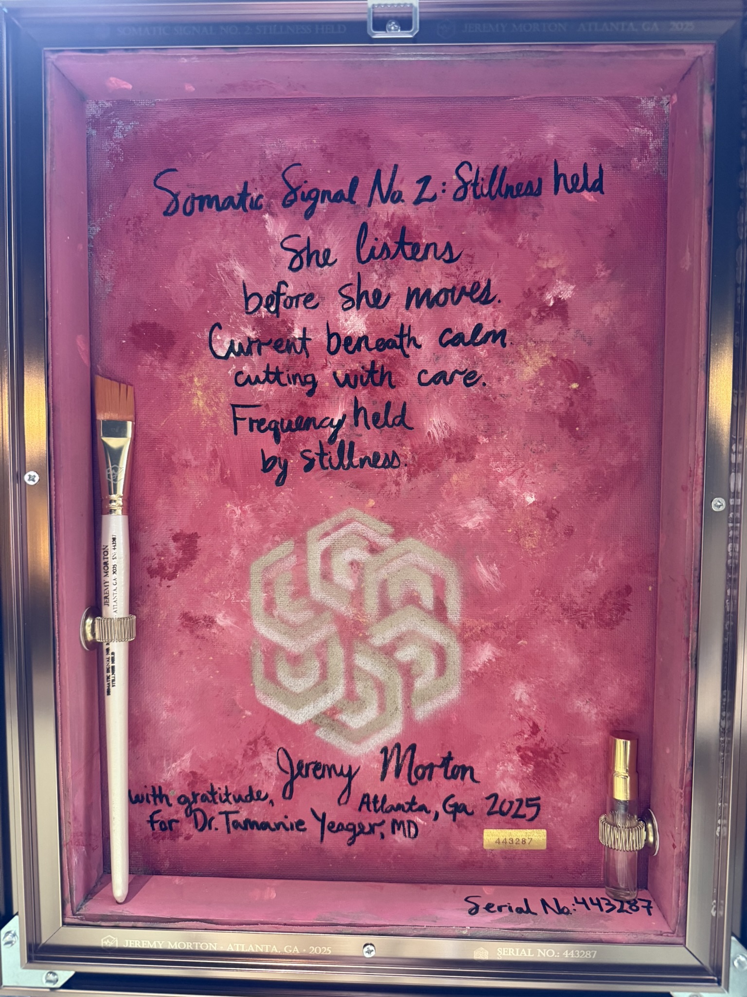 This painting was completed in the summer of 2025 as a companion to Stillness Held, commissioned for a nurse whose presence in both performance and crisis mirrors the rhythm of response and recovery. Painted while Stillness Held was in development for Dr. Tamanie Yeager, this Echo Edition holds the same frequency—but through sound, not silence. Dr. Yeager and I have performed more than 360 surgeries together in Atlanta—thyroid, parathyroid, and deep neck cases where nerve preservation is everything. This painting was created in gratitude for her calm command in the operating room, and for trusting me to be the signal reader beside her healing hands.
