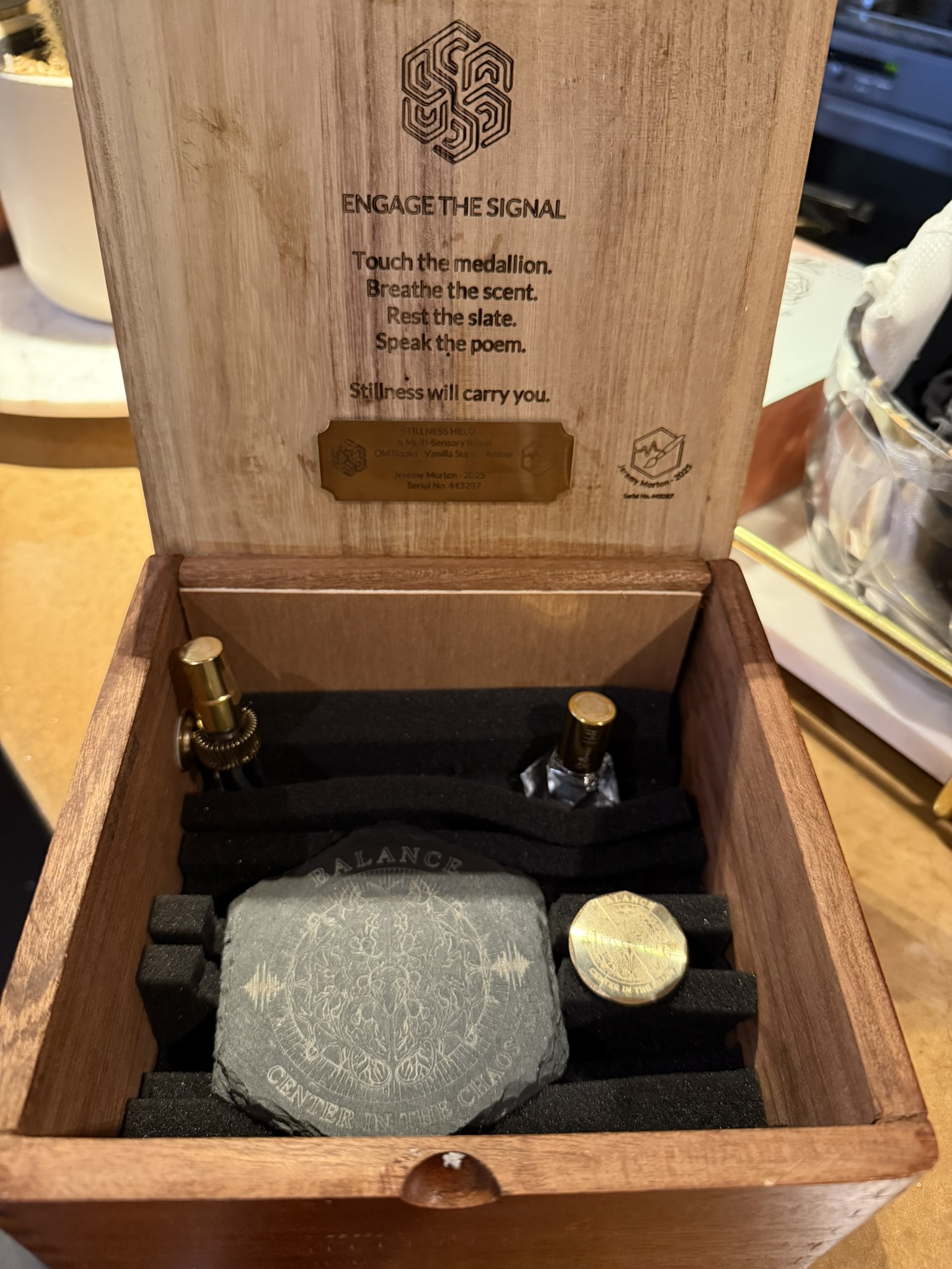 Touch the medallion. Breathe the scent. Rest the slate. Speak the poem. Stillness will carry you.