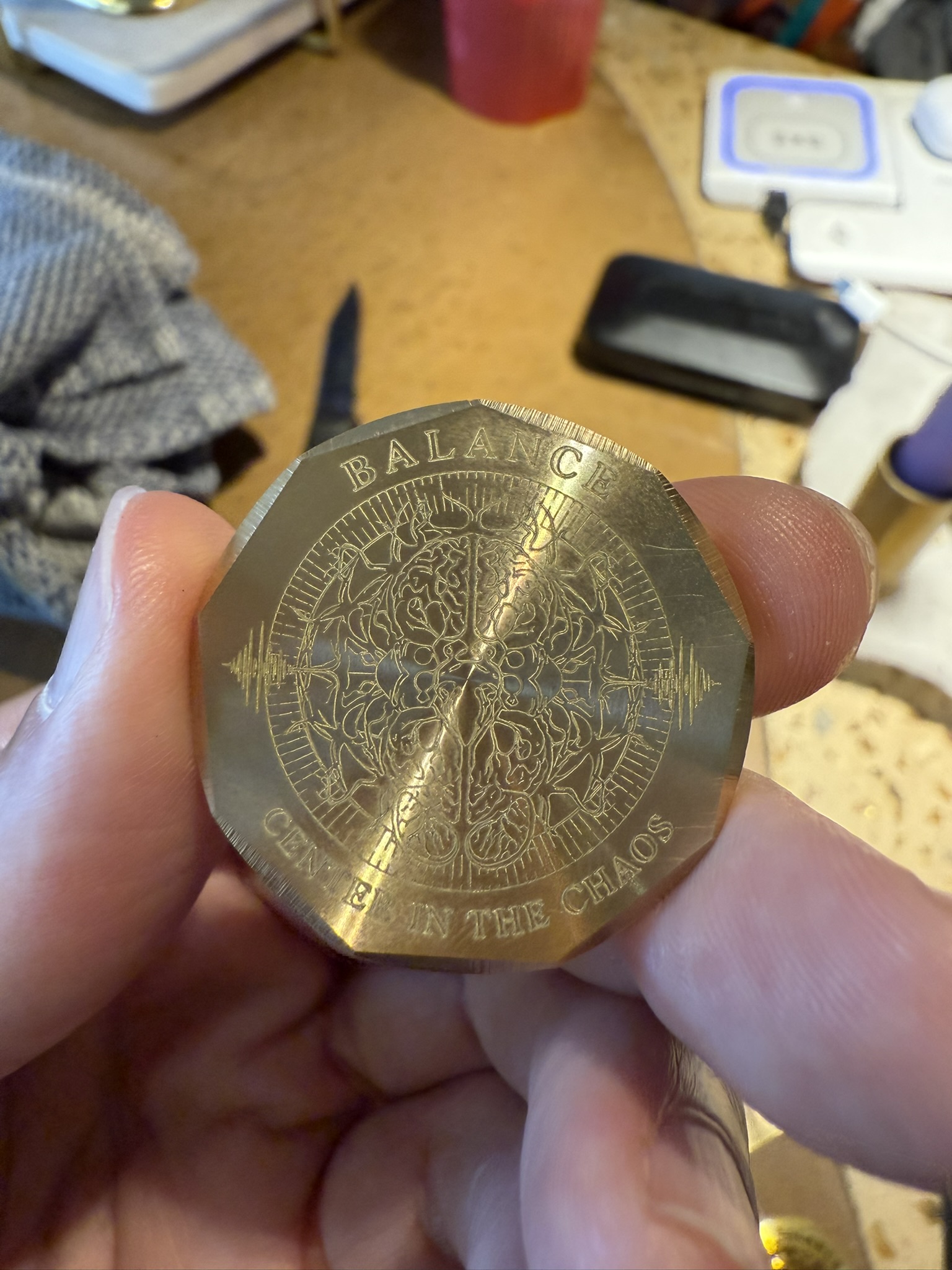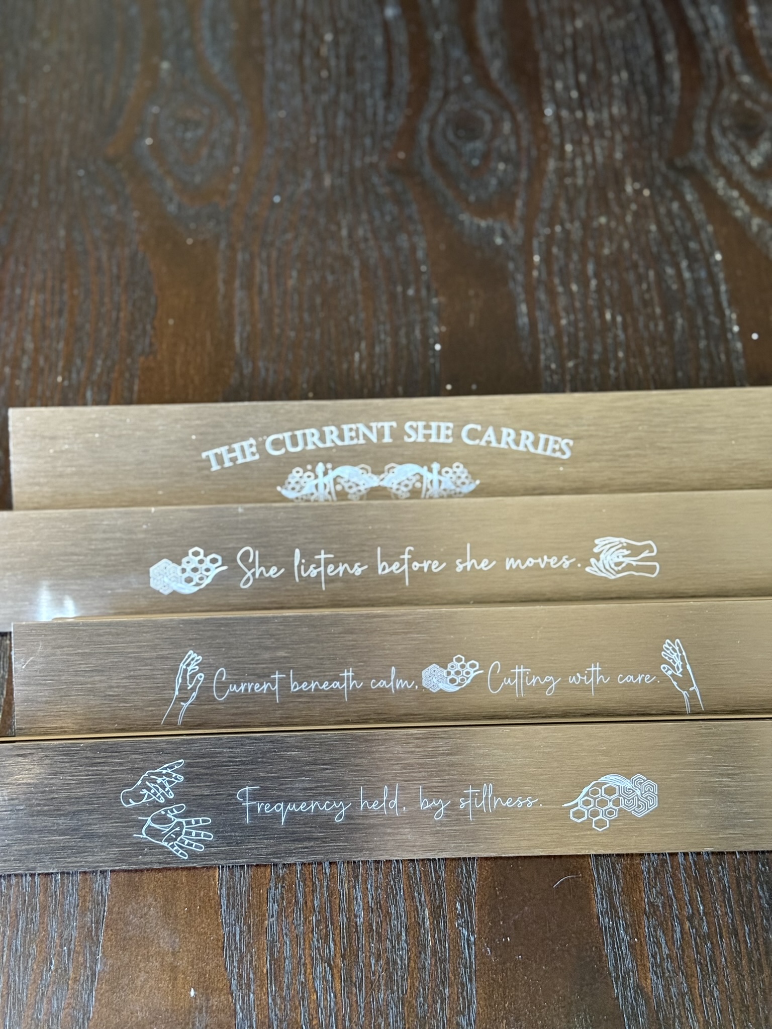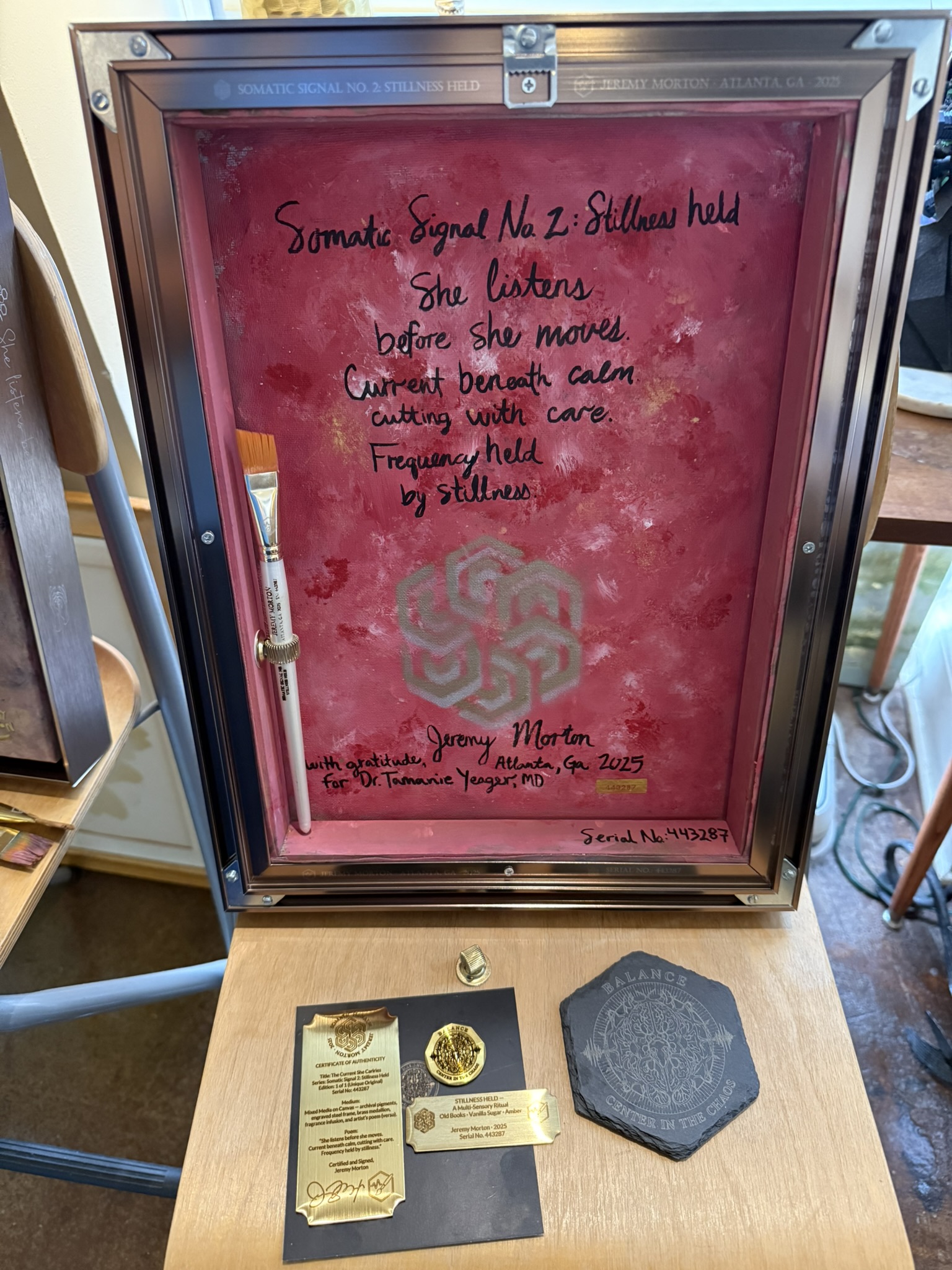 The back of both pieces is inscribed with the original Somatic Signal™ Poem. Each brass panel on the frame extends a single poetic line—engraved in script, etched with neuro-symbolic iconography.